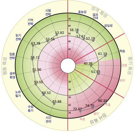 학습량, 주도적인 학습태도, 목표의식, 학습전략, 학습요령 등을 파악할 수 있으며, 학습자의 '자기주도학습지수'를 확인하고 '학습방법'과 '학습방법' 에 있어서 강점과 약점을 파악할 수 있습니다.